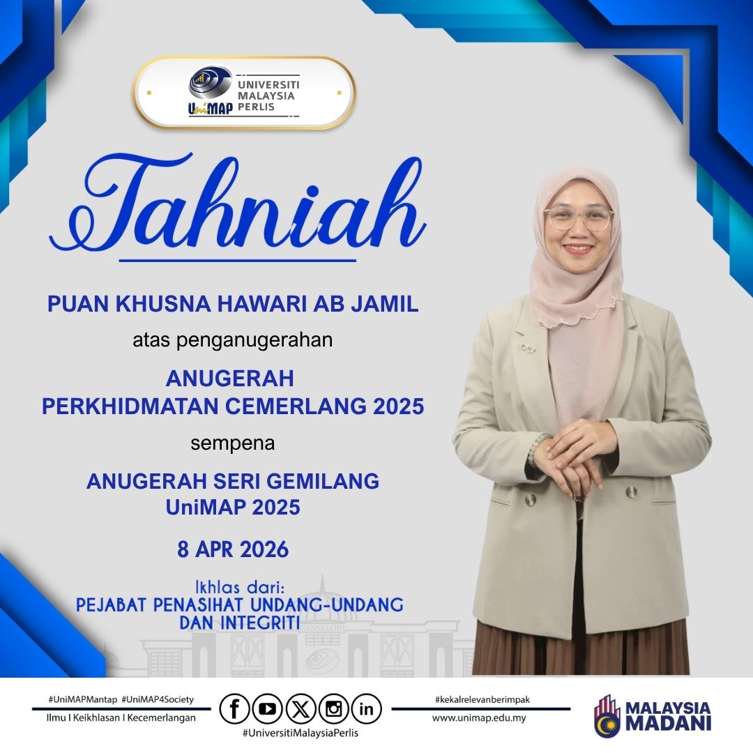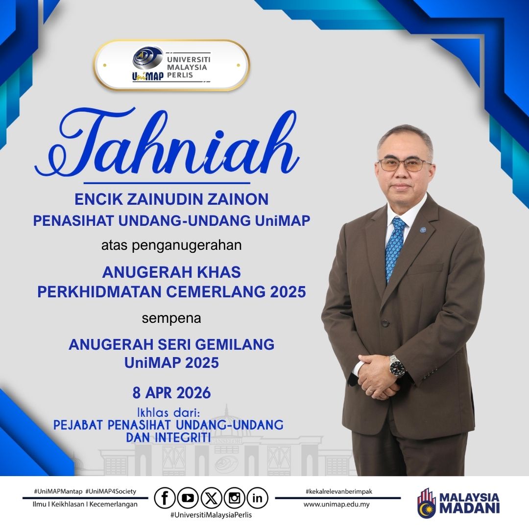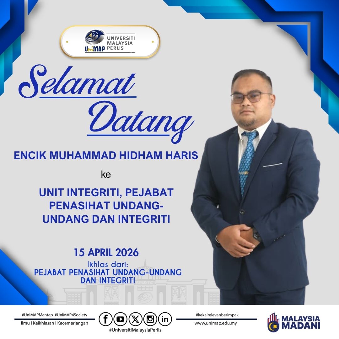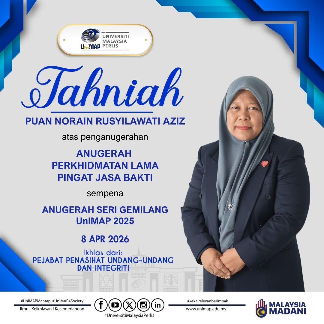 Selamat datang ke laman web rasmi Pejabat Penasihat Undang-Undang dan Integriti (Pejabat PUU), Universiti Malaysia Perlis (UniMAP). Kami mengalu-alukan kehadiran para pengunjung ke platform rasmi ini yang berfungsi sebagai medium penyampaian maklumat, rujukan perundangan serta hebahan aktiviti berkaitan peranan dan fungsi Pejabat PUU.