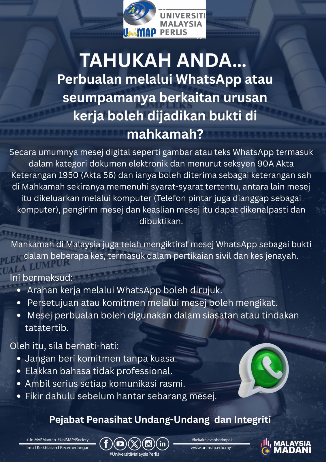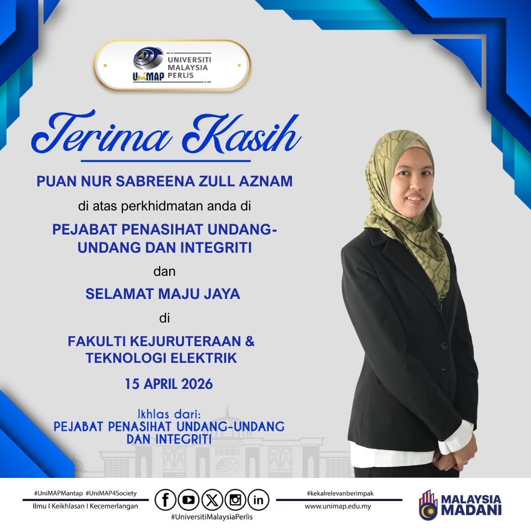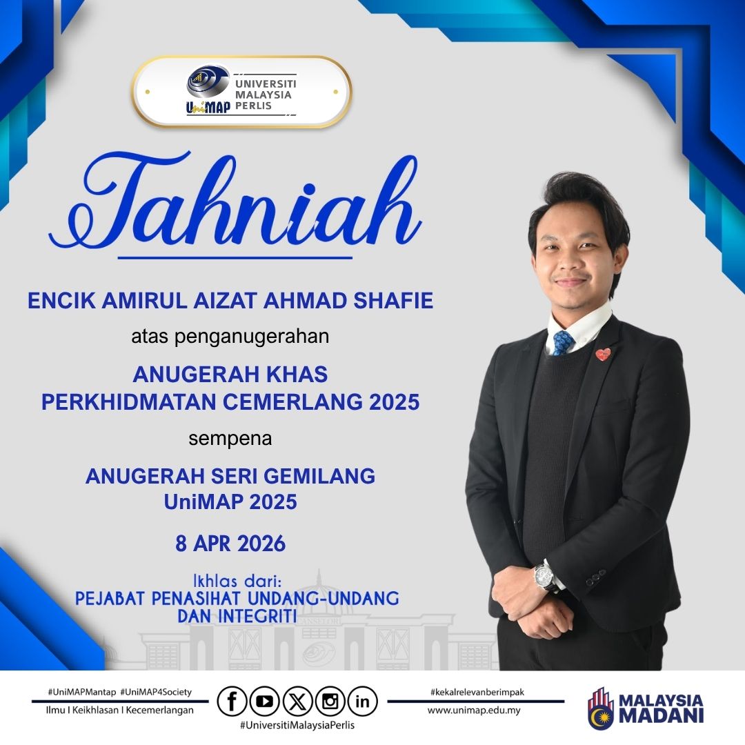 Selamat datang ke laman web rasmi Pejabat Penasihat Undang-Undang dan Integriti (Pejabat PUU), Universiti Malaysia Perlis (UniMAP). Kami mengalu-alukan kehadiran para pengunjung ke platform rasmi ini yang berfungsi sebagai medium penyampaian maklumat, rujukan perundangan serta hebahan aktiviti berkaitan peranan dan fungsi Pejabat PUU.