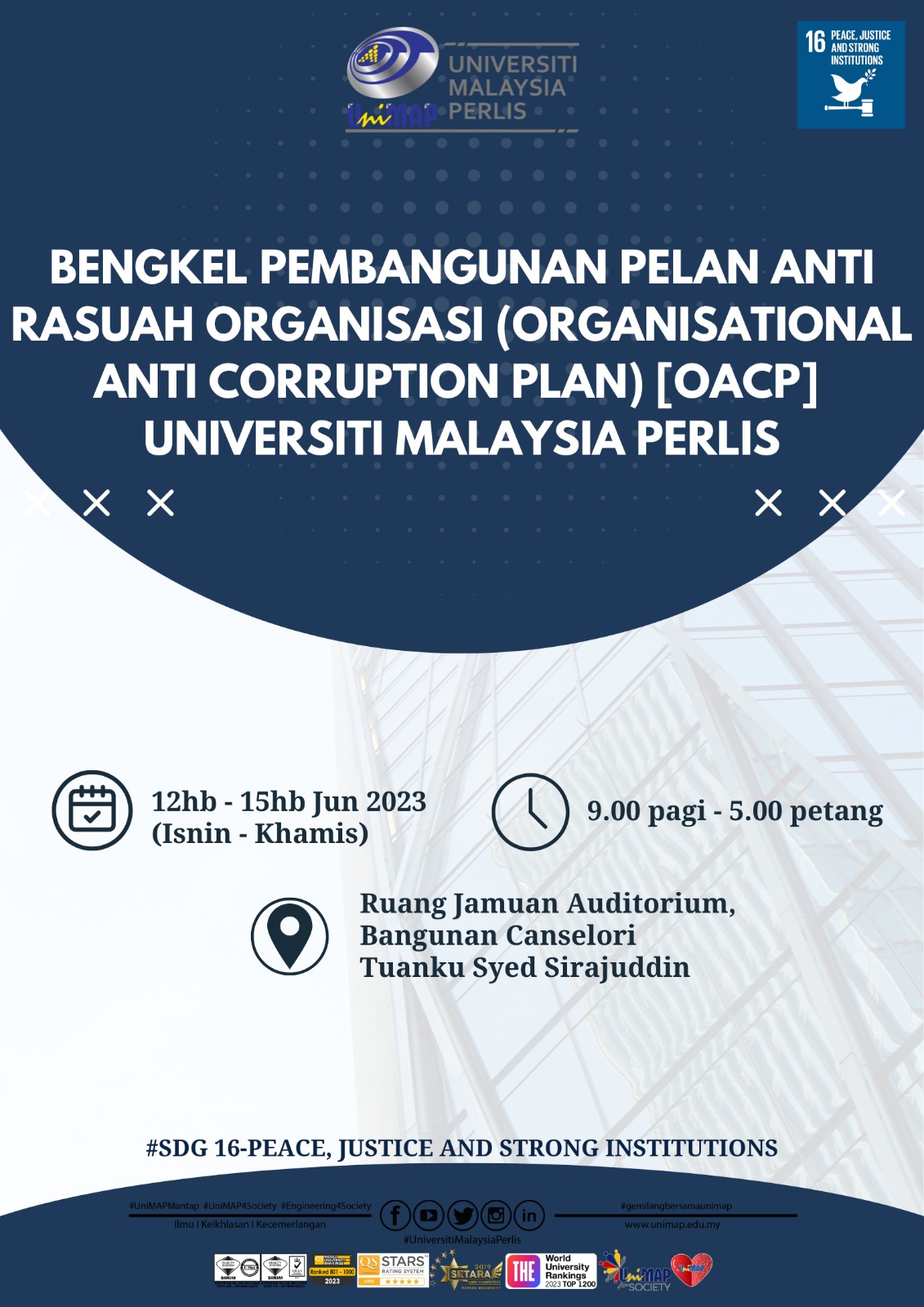 Telah berlangsung Bengkel Pembangunan Pelan Anti Rasuah Organisasi (Organisational Anti Corruption Plan) [OACP] Universiti Malaysia Perlis di Ruang Jamuan Auditorium, Bangunan Canselori Tuanku Syed Sirajuddin.