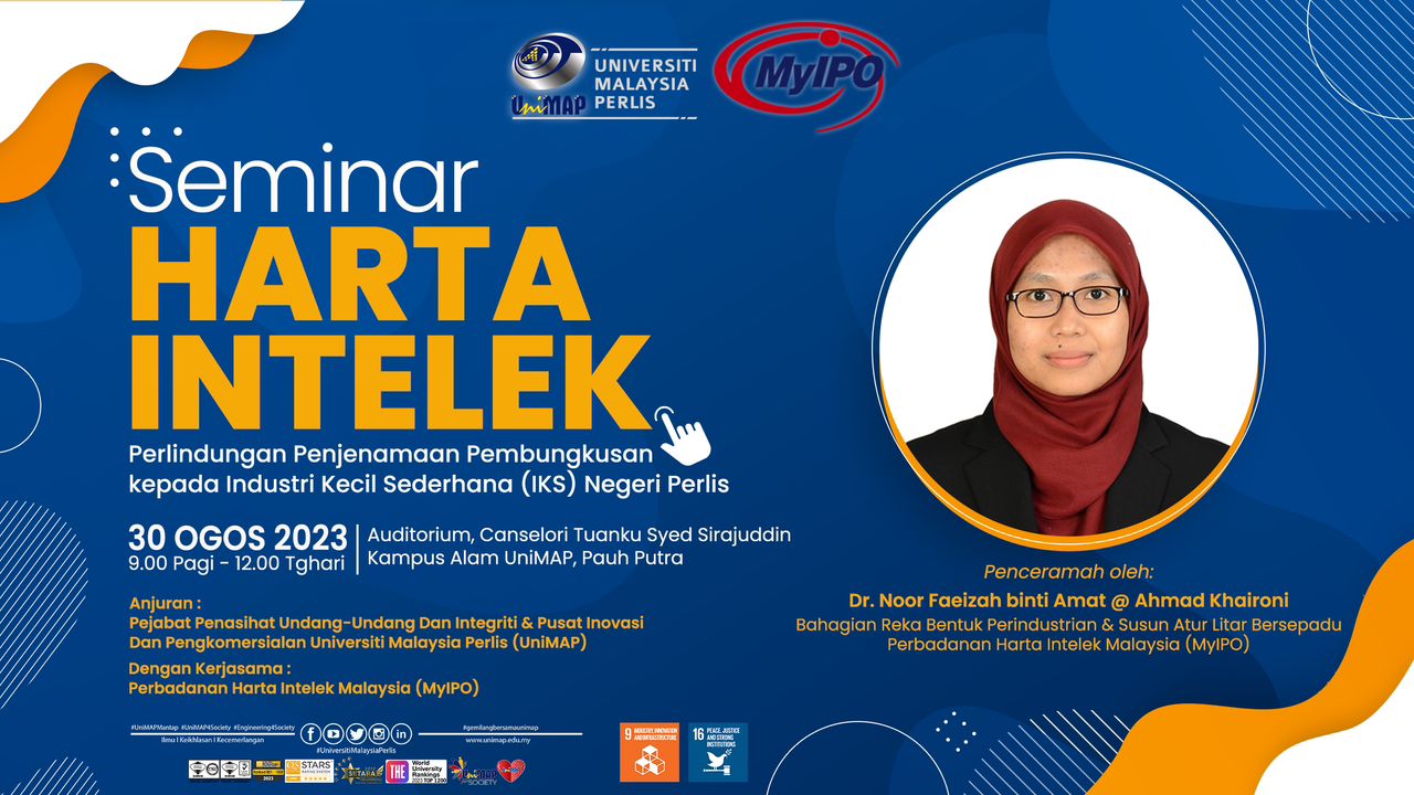 Anjuran Bersama Pejabat Penasihat Undang Undang dan Integriti & Pusat Inovasi dan Pengkomersialan Universiti Malaysia Perlis (UniMAP) dengan Kerjasama Perbadanan Harta Intelek Malaysia (MyIPQ).