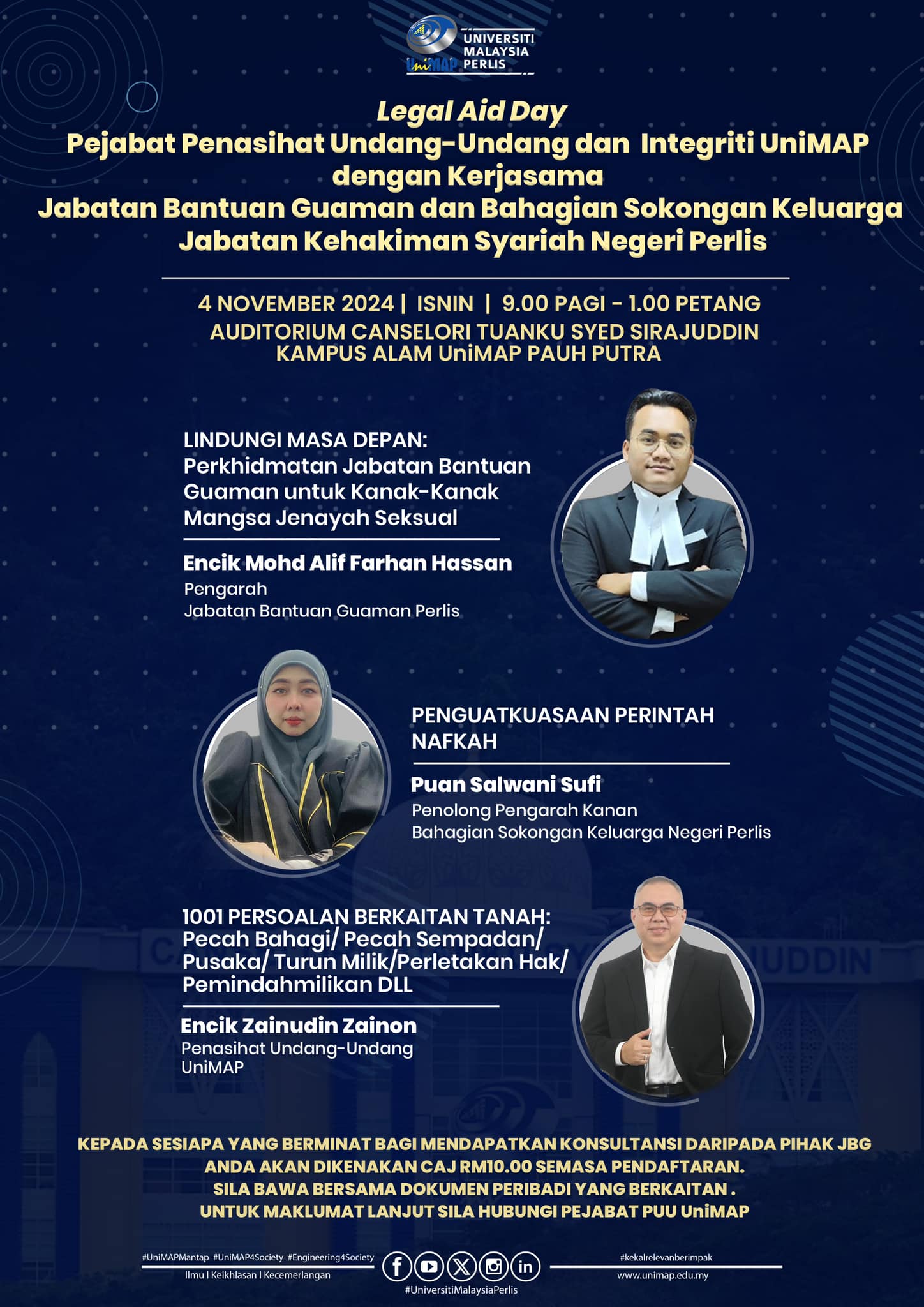 Telah berlangsung program Legal Aid Day Pejabat Penasihat Undang-Undang dan Integriti UniMAP dengan Kerjasama Jabatan Bantuan Guaman dan Bahagian Sokongan Keluarga Jabatan Kehakiman Syariah Negeri Perlis.