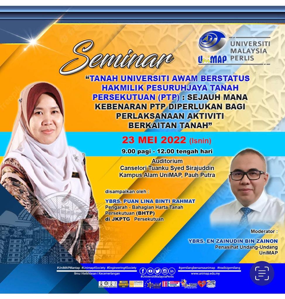 This seminar aims to increase understanding and knowledge regarding laws, regulations, and governance in the use of UniMAP lands owned by the Federal Land Commissioner among UniMAP staff and officers, particularly those from PTj/ Departments directly involved in activities involving the use of land and building premises at UniMAP.